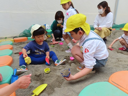 お天気の中、年長児の子どもたちと一緒に砂場で遊びました♪