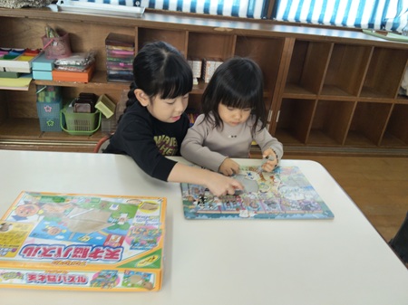 アンパンマンパズルをするお友だち。